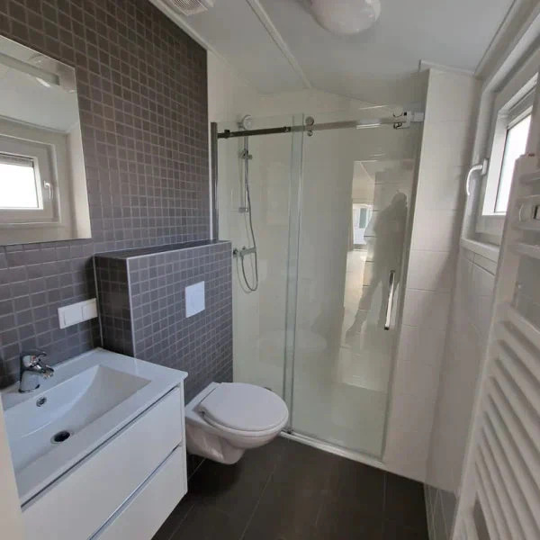 La cocina, equipada con muebles altos, frigorífico/congelador integrado, microondas combinado y campana extractora, está lista para sus creaciones culinarias. El baño, totalmente alicatado, incluye un WC con tanque integrado, una amplia ducha de 80×120 cm con mezclador termostático y muebles de lujo con espejo e iluminación. Cada detalle ha sido pensado para su bienestar y el de su familia.