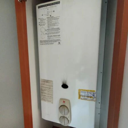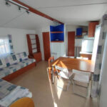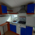 Incluye equipamiento esencial: frigorífico, placa de cocina, extractor, banco de asiento, calentador de agua a gas y radiador eléctrico.
