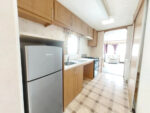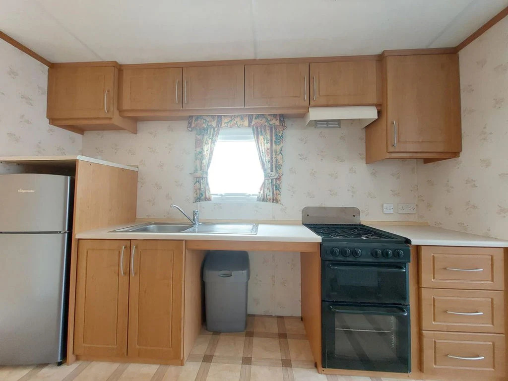 El salón cuenta con una gran ventana, mientras que la cocina en forma de U está equipada con un frigorífico y congelador combinados.